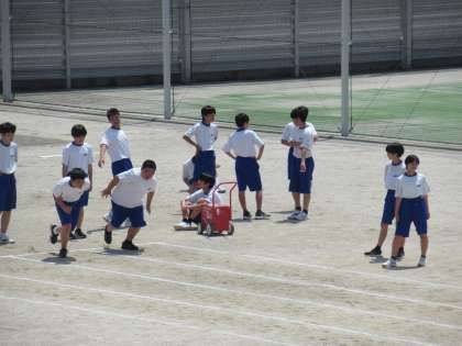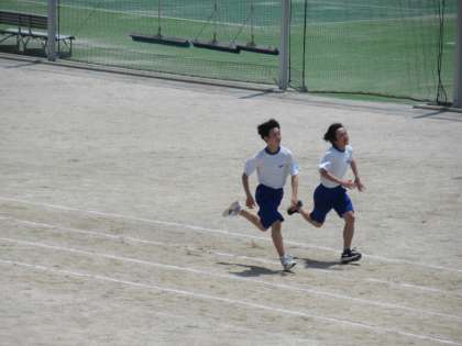 写真上・中は、保健体育の授業の様子です。50メートル走の計測中です。