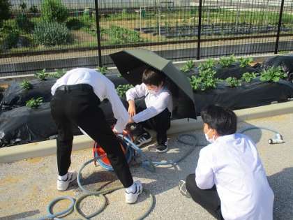 学校の畑に、水やりをしています。ホースが絡まっているのを一生懸命に直してくれました。