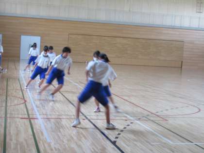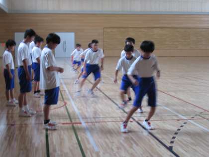 今日は、体育館で授業をしています。グラウンドは暑いので、体育館内は涼しく感じられますね。反復横跳びの回数をペアでカウントし合っています。