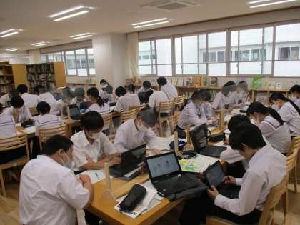 写真下は国語の授業の様子です。主題文を書くための情報収集をしています。