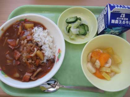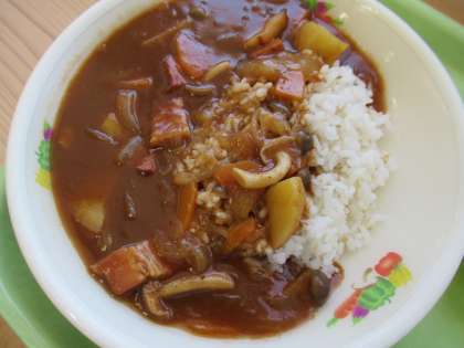 「たべキリン」の「た」はたまねぎ、「べ」は、ベーコン、「キ」はキノコ、「リン」はりんごです。それぞれの味が出たおいしいハヤシライス。ぺろりと「たべキリン!」ですね。