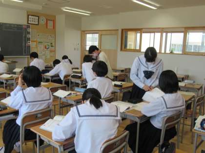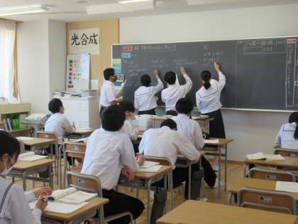 写真上・中は、数学の授業の様子です。因数分解の問題演習中です。少人数による授業のため、発表の機会や質問の機会が多くなりよいですね。