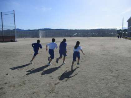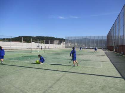 陸上競技部とソフトテニス部が青空の下で元気に活動しています。