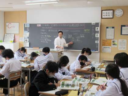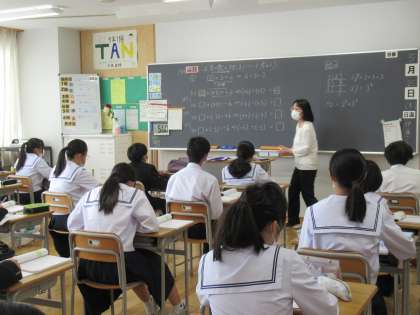 写真下は、数学の授業の様子です。正負の数の除法について学習しています。