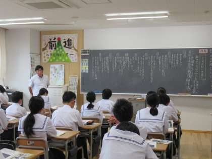 写真上は、国語の授業の様子です。漢字の熟語の学習中です。