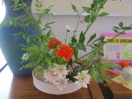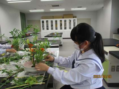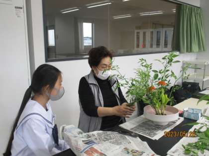 今日は、新入部員4人が、今日のテーマ『木物の扱い』に従ってお花の名前、生け方について、講師の先生から教わりながら生けました。