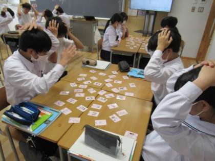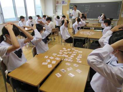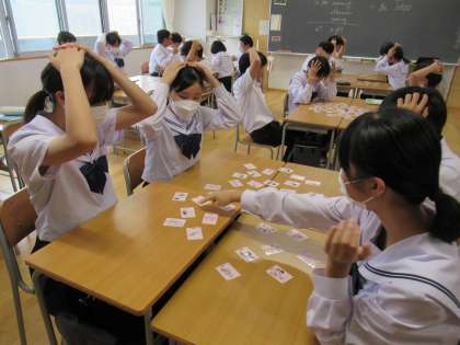 動詞カルタですが、先生はこれまで学習した表現を使った文を読み上げます。