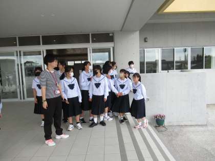 1年4組の生徒の元気いっぱいな挨拶で生徒玄関前は大賑わいでした。