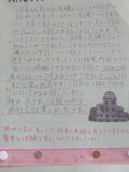 各教室の各自のポケットには、修学旅行を終えての感想が入っています。