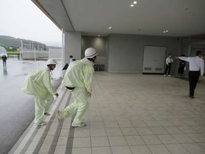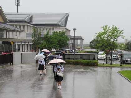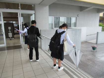 いつもよりかなり自転車通学生、徒歩通学生が少ないです。その中でも雨具を着てたくましく自転車で登校してくる生徒もいます。