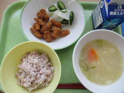 6月5日(月) 今週は「かみかみ献立」です 公開日 2023/06/05 更新日 2023/06/05 八尾中学校のページ 今日のメニューは、 1 雑穀入りご飯 2 牛乳 3 すいとん 4 いかのカリン揚げ 5 2色ピクルス です。 昨日紹介したとおり、6月4日から10日は「歯と口の健康週間」です。給食もそれに合わせて、「かみかみ献立」です。よく噛んで食べるメニューになっています。 今日は「いかのカリン揚げ」がよく噛むメニューですね。
