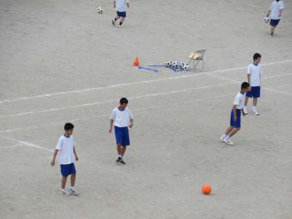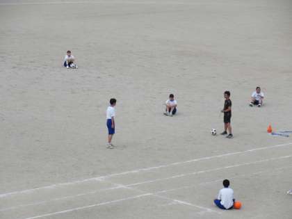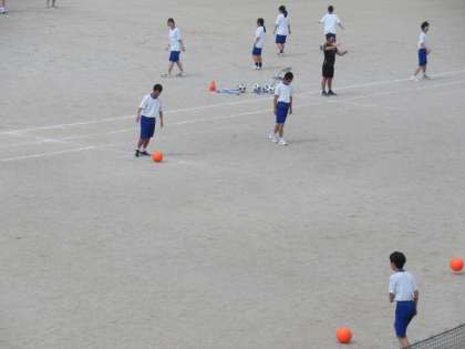 曇り空の下、グラウンドを広く使ってサッカー競技の学習をしています。