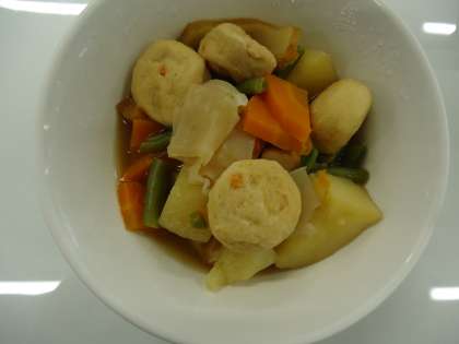 関東だきに入っている「がんもどき」は、水気を絞った豆腐に野菜や海藻、ごまなどを混ぜ、油で揚げたものです。おでんや煮物に使われることが多く、煮汁がしみこんで、柔らかくおいしくいただくことができます。煮汁がしみこんだ、おいしいがんもどきを味わっていただきましょう。