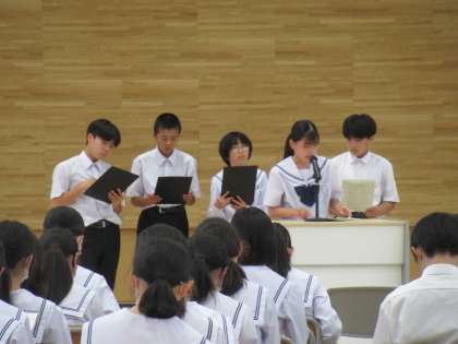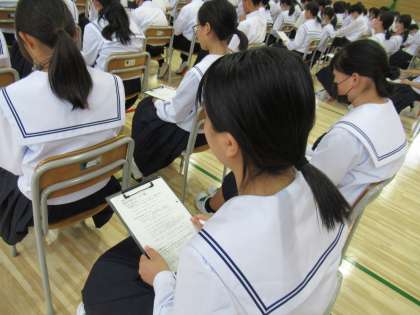6月12日(月) 1年生 宿泊学習に向けて その2 公開日 2023/06/12 更新日 2023/06/12 八尾中学校のページ 議長を中心に進行しています。学年生徒会からの提案を基に、話し合い、決議していきます。 生徒総会の先輩の姿が1年生につながっていっていますね。