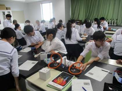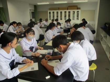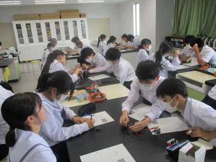 ダニエル電池を作り、電圧を計っているところです。みんな実験が大好きで、熱心に機器を操作したり、記録をとったりしています。
