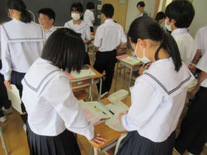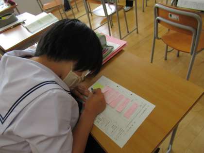 友達のメモを見た後、自席に戻り、自分のメモを見直しています。