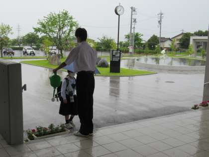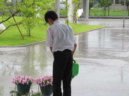 写真上中;雨の日も水やり?と思えば、軒下のプランターは、雨がかからないので水をあげています。責任をもって仕事をする美化委員の生徒です。