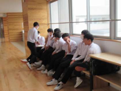 写真下:教室前の廊下のベンチで和やかに過ごしているほのぼのした風景です。