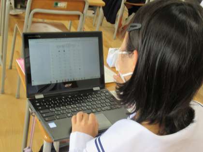 メモを基にしながら、「好きなこと」を紹介しています。聞き手は、chromebookに評価・感想を記入しています。