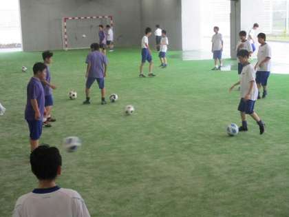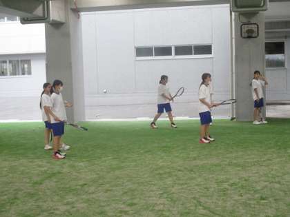 大雨のためグランドが使えませんが、広いピロティーがあるおかげで、外の部の生徒達はのびのびと練習しています。