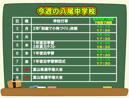 また、今週は1年生の宿泊学習、来週は2年生の校外学習があり、それぞれの課題に取り組むだけでなく、仲間のよさを再発見できるとよいですね。