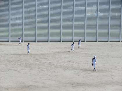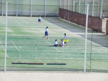 テニスコートでは、ソフトテニス部、グラウンドではサッカー部と野球部が練習に励んでいます。