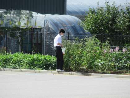 学校農園で今日も水やりや収穫をしています。ミニトマトがたわわになっています。