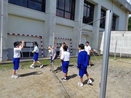 最後は、「くもの巣」です。一人ずつ、別々の場所からくぐり抜けるというル−ルです。