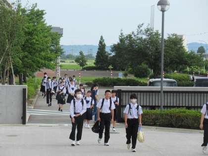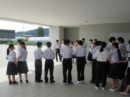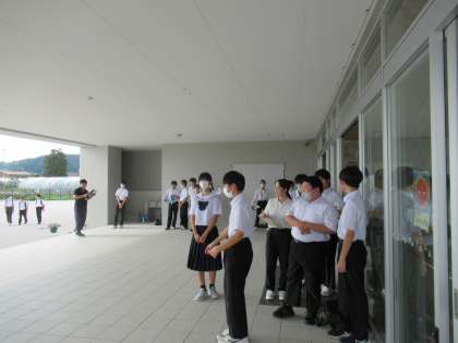 あいさつリレーに、担当ではないボランティアの生徒も参加しています。