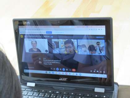 教室、学年室、図書室、コンピュータ室の4会場に分かれ、10グループがマレーシアの10グループとオンラインで交流しました。