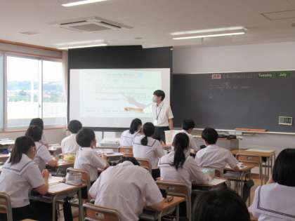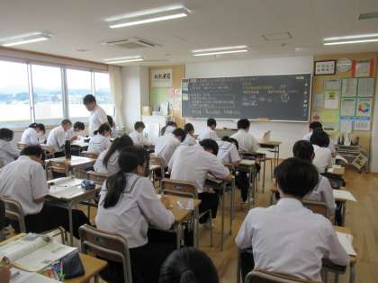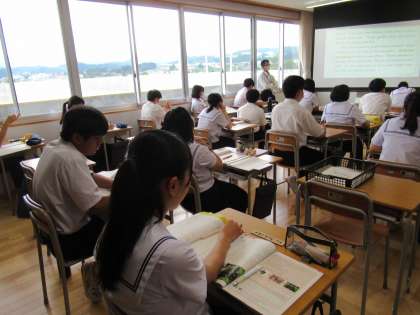 写真上・中は、英語の授業の様子です。英問英答のコツを学んでいます。