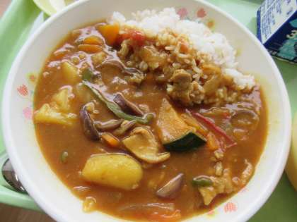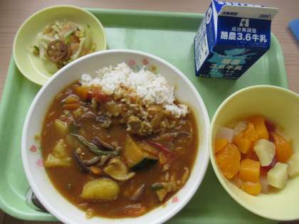 キュウリ、ナス、トマト、ピーマン、オクラ、トウモロコシ、ニラ、カボチャ、ズッキーニ、ゴーヤ等です。今日のカレーには、ナスとかぼちゃが入っていましたね。
