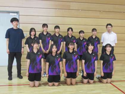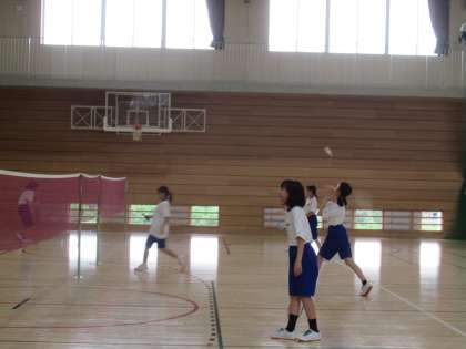 バドミントン部は、写真撮影中、1・2年生はコートでトレーニングをしたりラリーをしたりと練習に励んでいます。