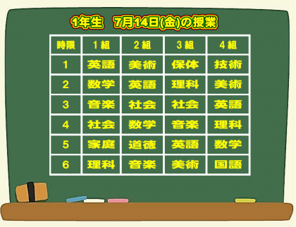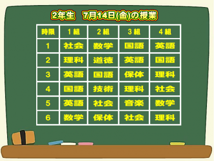 明日の授業予定です。通常の金曜日の教科と異なる場合があります。確認をお願いします。