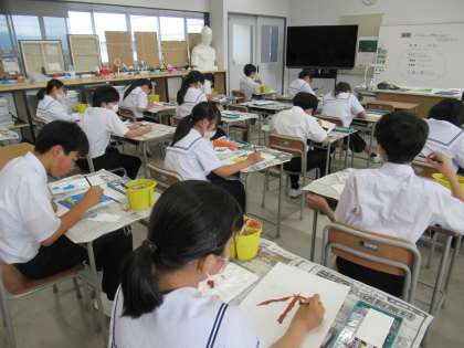 ポスターカラーの効果的な使い方を考えながら、着色中です。