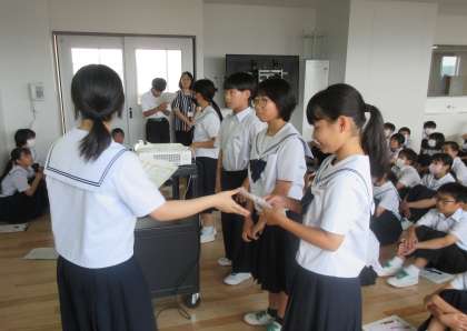 1学期も残り1日となりました。1学年は夏休みを控えて、まとめの学年集会を行いました。宿泊学習ではまとめ学習でよい新聞をつくった班に学年から賞状が渡されました。