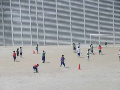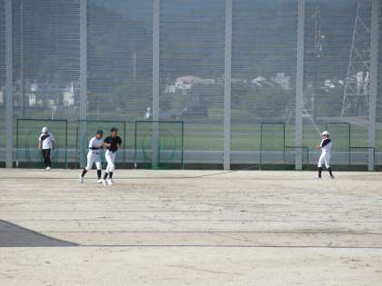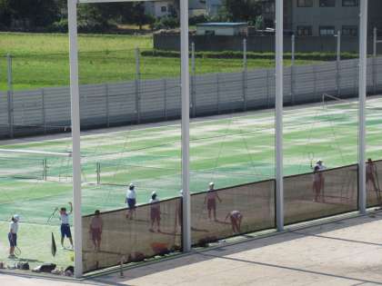 ソフトテニス部は、フェンスに向かって素振りの練習、野球部はグラウンドに水を撒いてからスタート。サッカー部はパス練習をしています。