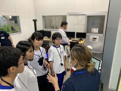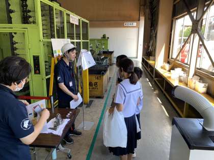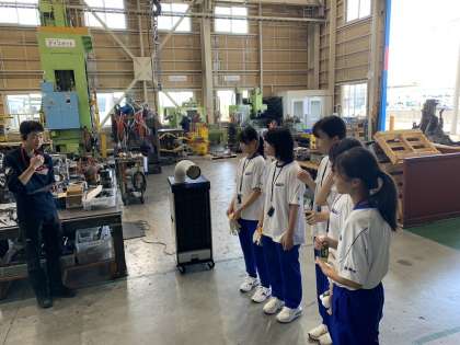 魚岸精機では、3〜5名の班に分かれて製造過程を見学したり、加工品に触れたりと、「本物」を体験しています。
