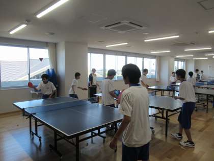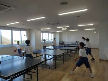 卓球部は、今日もエアコン稼働の集会室で練習しています。