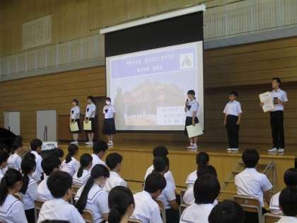 始業式に先立ち、夏休み中に行われた大会・コンクール等で活躍した生徒が、受賞報告をしました。一人一人が受賞の喜びや今後の抱負を述べると、会場は大きな拍手に包まれました。