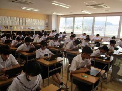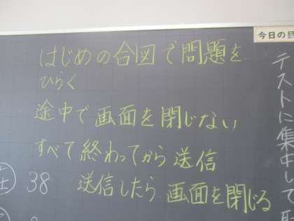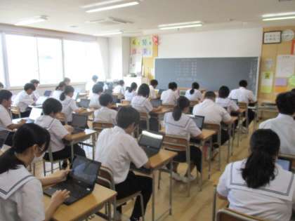 2年生は、クロムブックでテストという初の試みです。各自、画面に向かって問題に取り組んでいます。新しい取組ですが、生徒はすぐに適応しています。