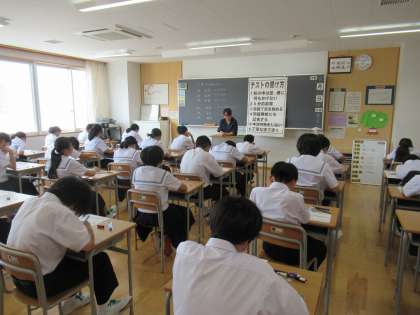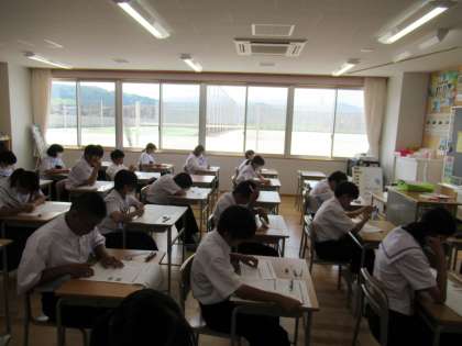 今日は、社会、理科、英語の3教科のテストに取り組みます。エアコンの効いた快適な環境でテストを受けています。