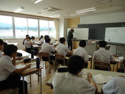 写真上は、数学の授業の様子です。「方程式の応用」について学習しています。