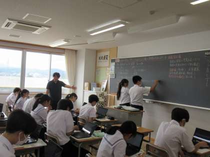 写真中は、理科の授業の様子です。生物の進化について学習しています。