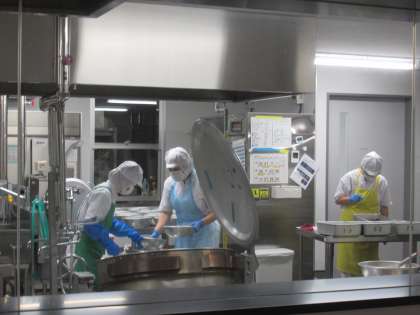 給食室では、調理員さんらが忙しそうに調理しておられます。美味しい給食の秘密はここに。