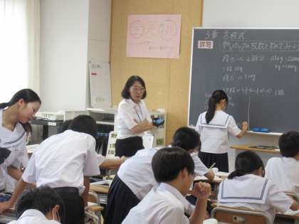 写真上は、数学の授業の様子です。自分の考え方を黒板に書いています。