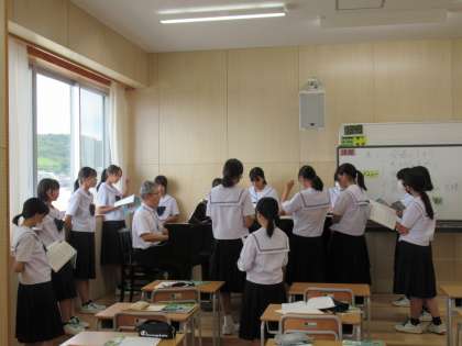 写真中は、音楽の授業の様子です。合唱コンクールに向けて練習をしています。