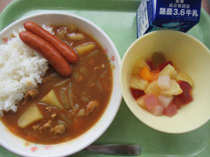 9月12日(火) 今日の給食は? 公開日 2023/09/12 更新日 2023/09/12 八尾中学校のページ 今日は、大好きな給食メニュー トップ3にいつもランキングしているカレーです。 ご飯の上にかかっているので「カレーライス」です。 1 カレーライス 2 牛乳 3 あらびきウィンナー 4 フルーツカクテル です。 フルーツカクテルは、色とりどりできれいですね。宝石のようです。