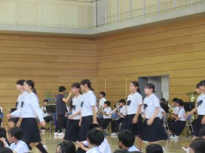 9月13日(水) 壮行会 その1 公開日 2023/09/13 更新日 2023/09/13 八尾中学校のページ 新人大会及び県駅伝大会に向けて、壮行会を行いました。 3年生からバトンを受け継ぎ、1・2年生の新チームになっての初めての公式戦です。 暑い夏の練習を乗り越え、いよいよ金曜日挑みます。 各部長が一言意気込みを語りました。 入場の様子です。胸を張って堂々と入場です。吹奏楽部が演奏をしました。
