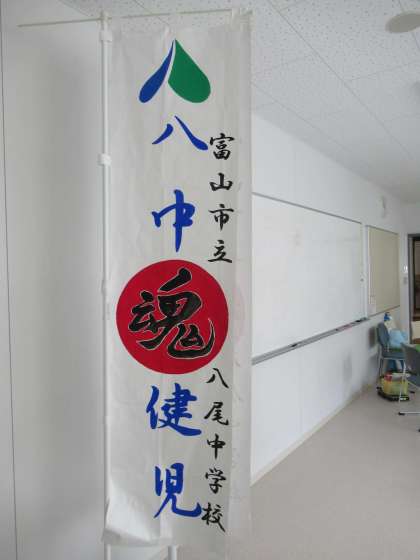 昨日、壮行会で披露し、思いを聴き、お礼を述べた用務員さんお手製の「のぼり旗」です。さっそく、体育大会、駅伝大会等で使わせていただきます。